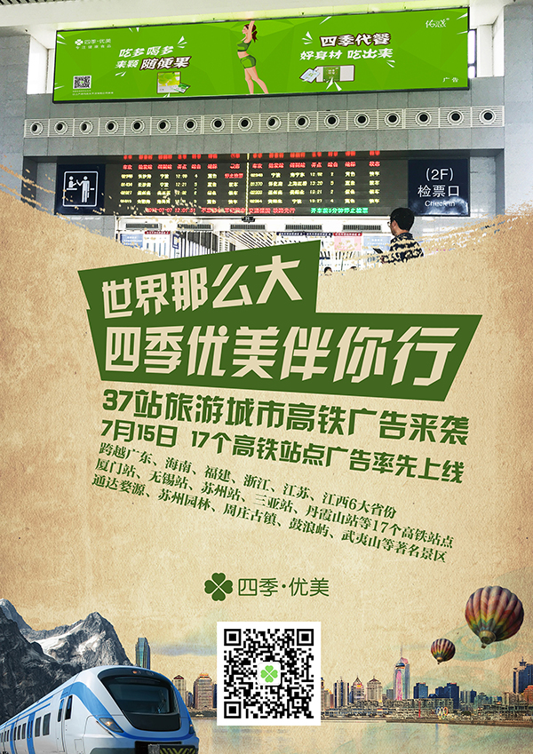 四季優(yōu)美已多次與高鐵廣告平臺(tái)合作。中國進(jìn)入高鐵時(shí)代后,高速鐵路作為一種新的運(yùn)營方式和媒體資源,在品牌傳播中發(fā)揮著巨大的作用。